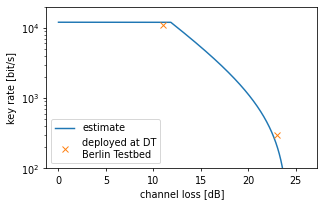 Below we show an estimation of the keyrate vs channel loss. There is a maximum detector count rate. There is an exponential decrease at medium loss and a drop off due to dark counts, which increase the qber. The curve in the plot is \[ R(1 - h(q)), \] where \( q \) is the qubit error rate, \( h(q) = -q\log(q) - (1-q)\log(1-q) \) the binary entropy function and \( R \) the click rate with matched bases. This curve does not take finite size effects into account (the data points do).
